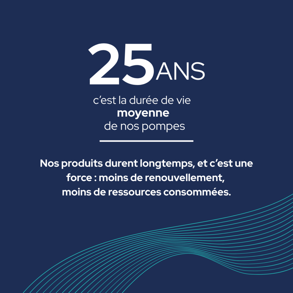 - 25 ans de durée de vie moyenne pour nos pompes : moins de renouvellement, moins de ressources consommées.